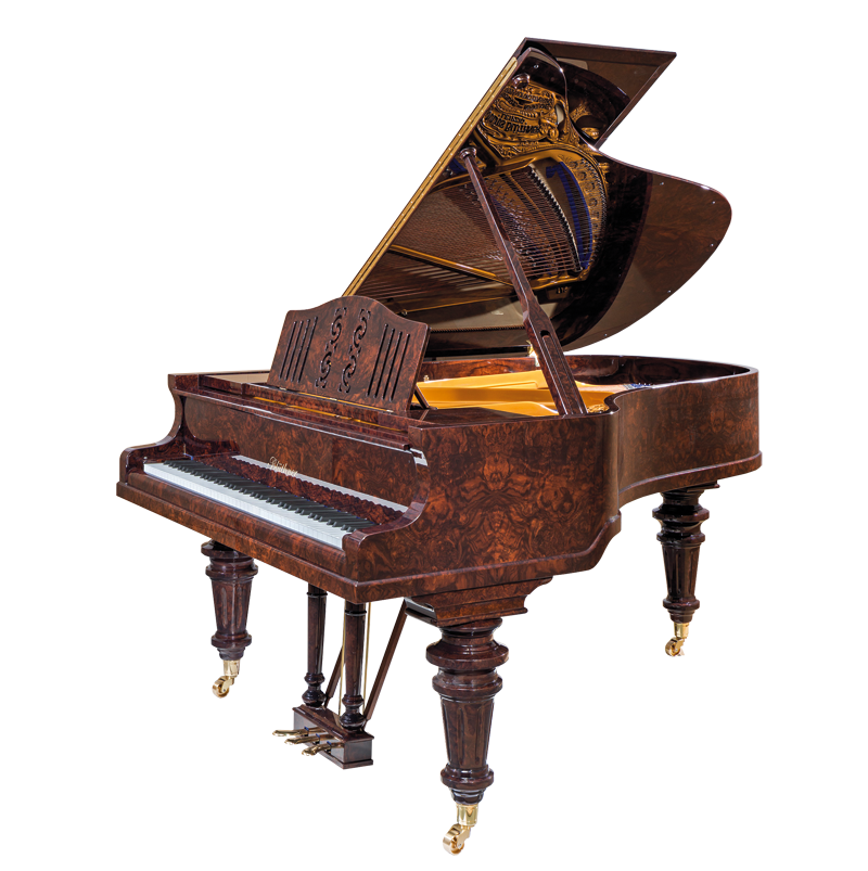 This instrument is designed in the style of this time, executed in precious rosewood, enhanced with hand carved ornaments and applications, with powerfully styled legs and a finely etched music desk, and perfectly conveys the philosophy of that period. The styling of this instrument rightfully bears the name Queen Victoria.