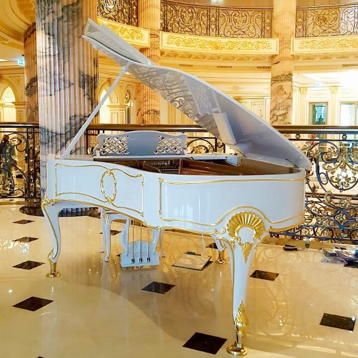 The exterior of this breathtaking instrument has been designed in the style of the fanciful French king. The grace and delicateness of the ornamentation is based on elements of the Rococo style. The legs, lyre, music desk and the rim are decorated with carvings tastefully gilded with real gold. To reproduce the original style and design of this instrument is both a demanding and satisfying task.