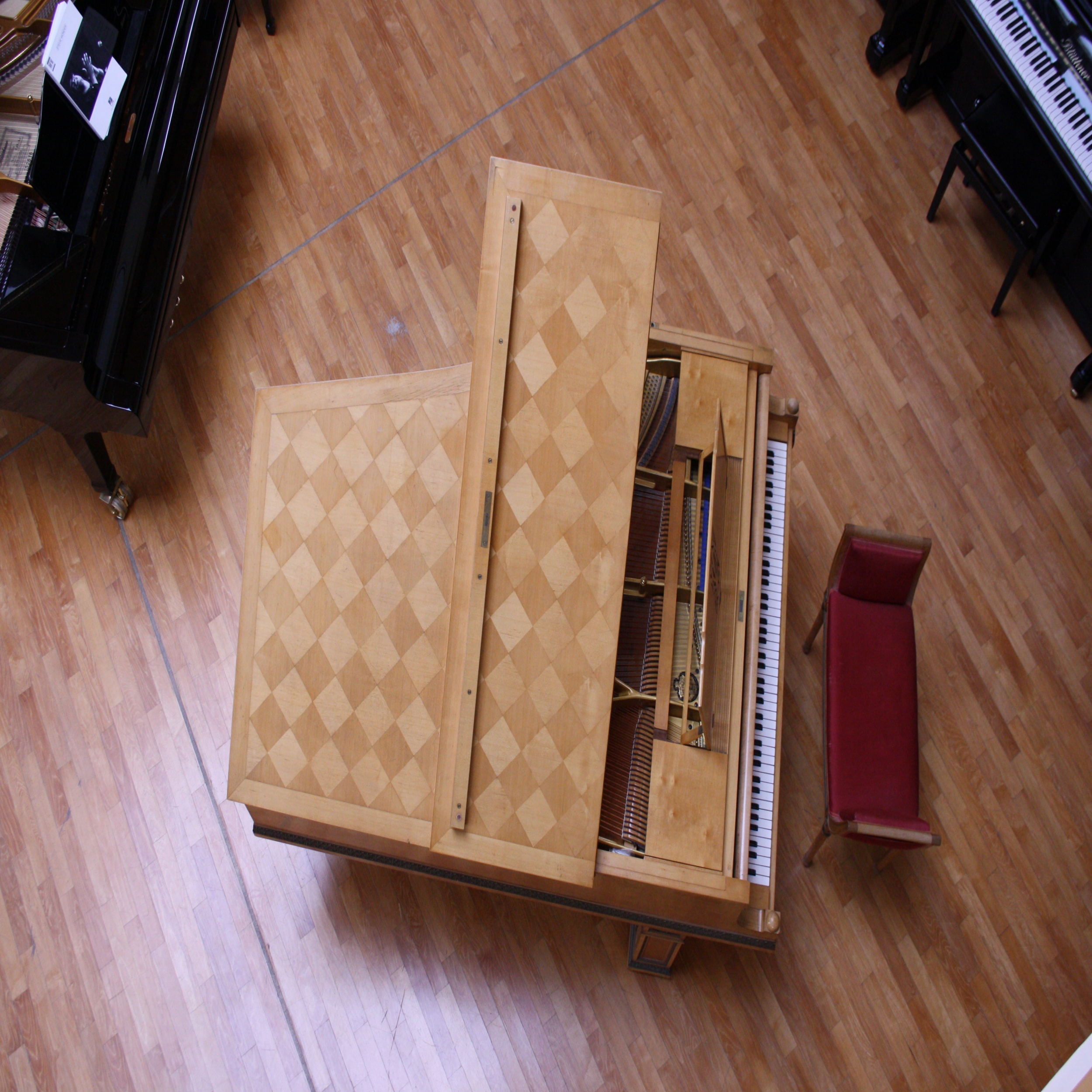 This is a traditional style from around the turn of the nineteenth century. This masterpiece of design displays the grandeur of the instrument and the owner. The turned legs, heavy lyre, and decorative music desk bring back memories of imperial times. This instrument is available in traditional black as well as other veneers.